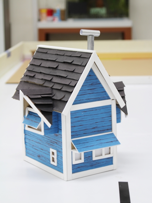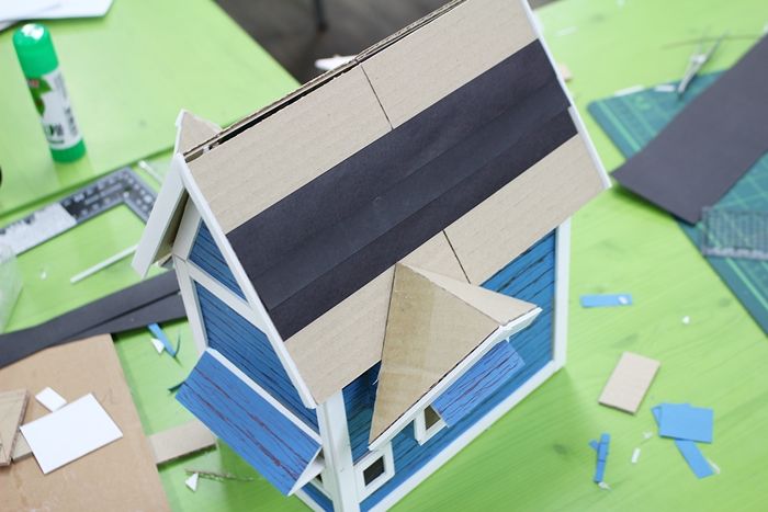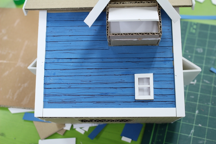 종이상자는 집의 뼈대이구요, 색도화지는 벽(파랑색)과 지붕(검은색)에 효과를 주었어요