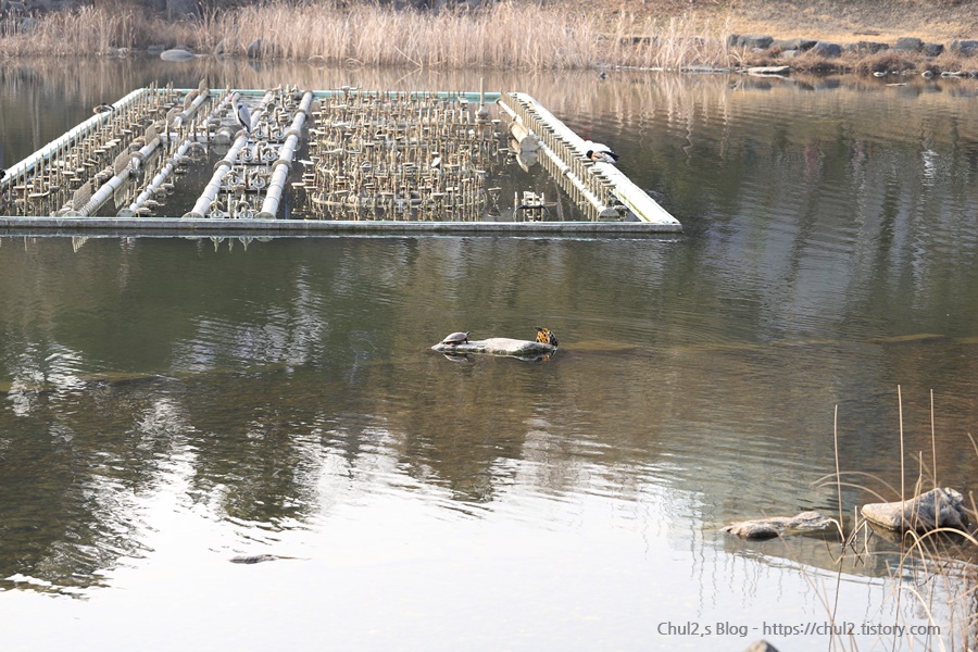 연못속 자라가 바위위에 올라 일광욕하는 모습도 보았어요